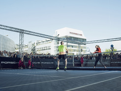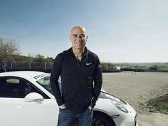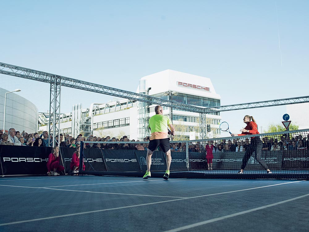 Tennis superstar Andre Agassi in front of the 911 GT3, Test Track Weissach