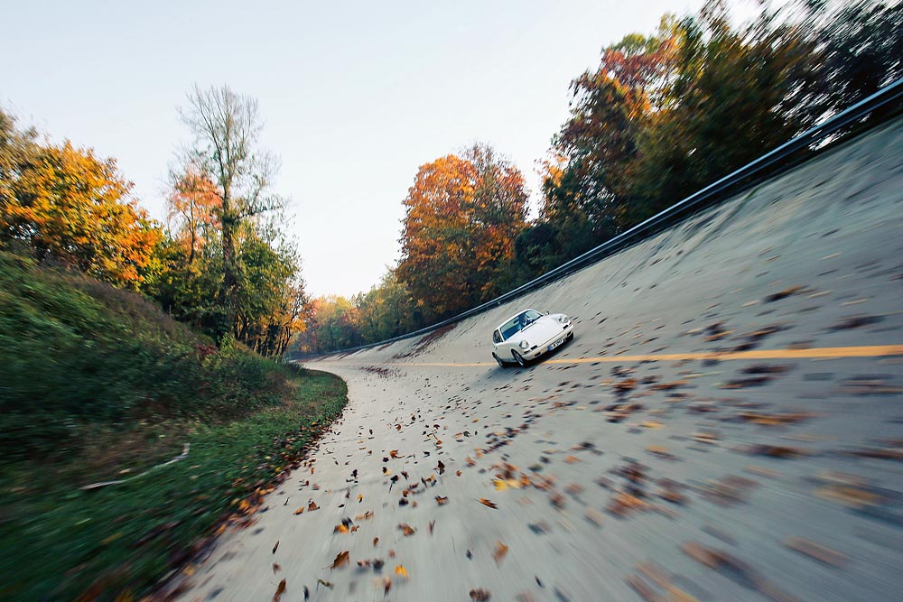 "The Porsche 911 R from 1967 on the banked walls of Monza"