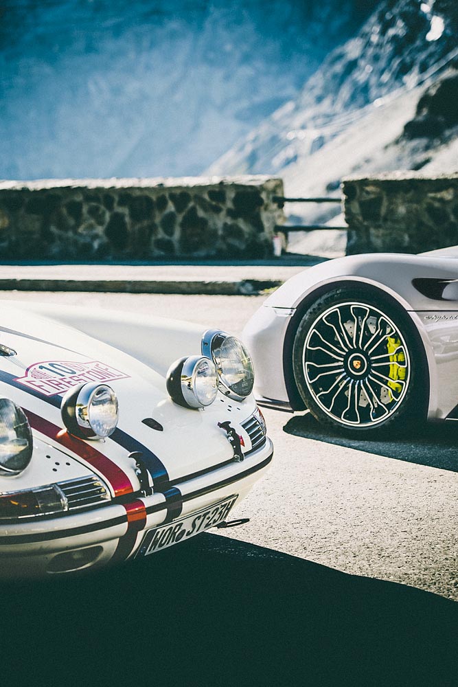 Porsche 918 Spyder and Porsche 911S Rally Firestone at the Stelvio Pass