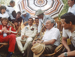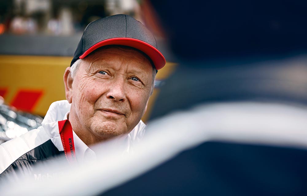 1981: Ferry Porsche and Wolfgang Porsche amidst members of the Porsche Motorsport team