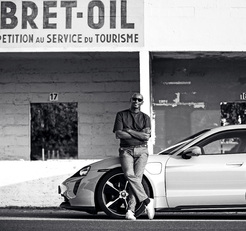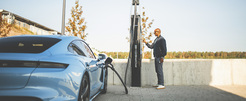 Hurui Issak, Project Manager of Porsche Carrera Cup Deutschland, and a Porsche Taycan 4S at a fast charging station