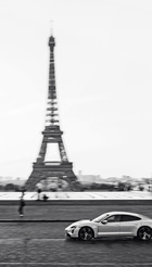 Porsche Taycan 4S in front of the Eiffel Tower in Paris, France