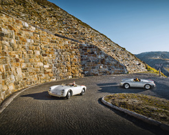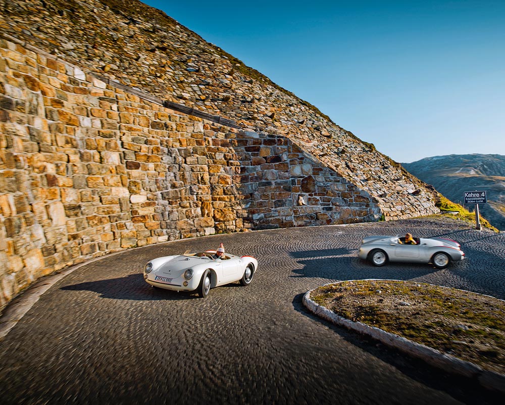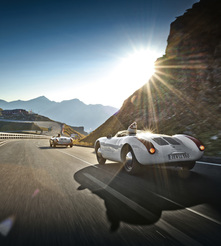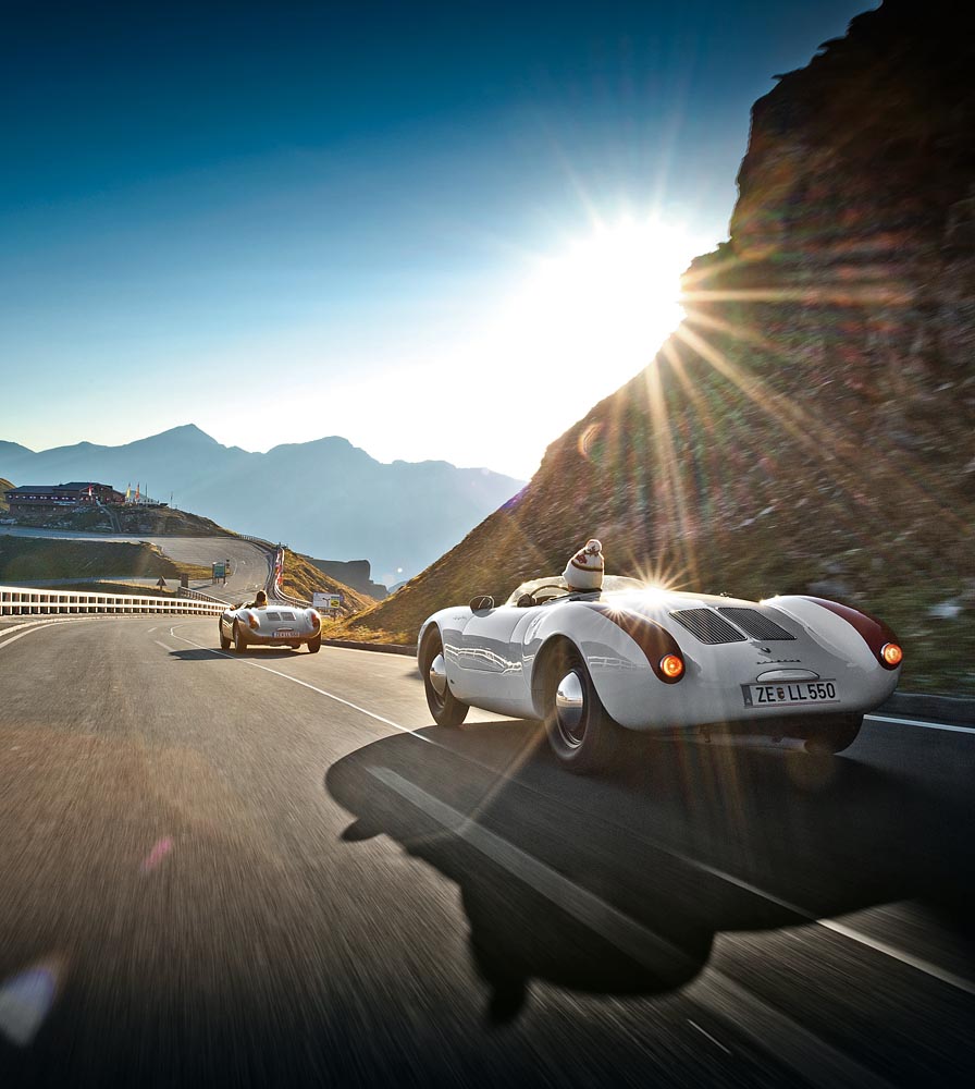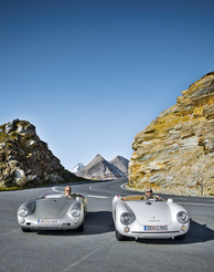 Ferdinand Porsche and Dr. Wolfgang Porsche in two Porsche 550 Spyder on the Großglockner High Alpine Road