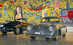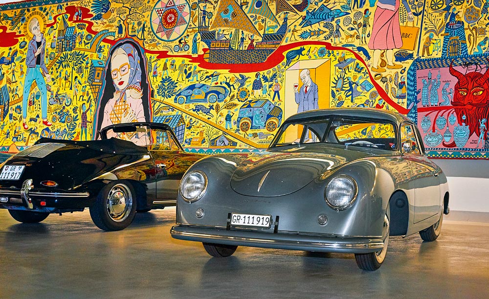 Lord Norman Foster's Porsche 356 in front of a Grayson Perry mural