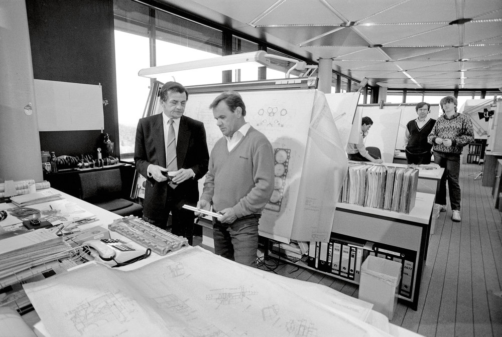 Engine developer Hans Mezger (left) and engineer Valentin Schäffer