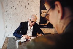 Luca Trazzi sketching in a café in Milan