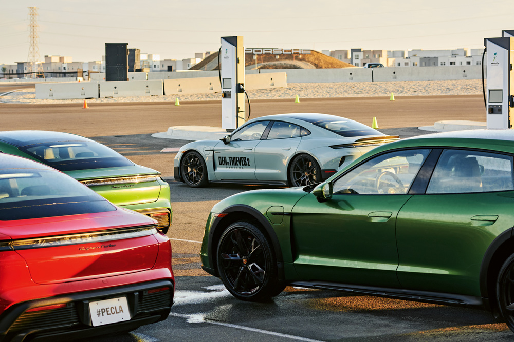 Several Porsche Taycan Turbo models at the Porsche Experience Center in Los Angeles, USA