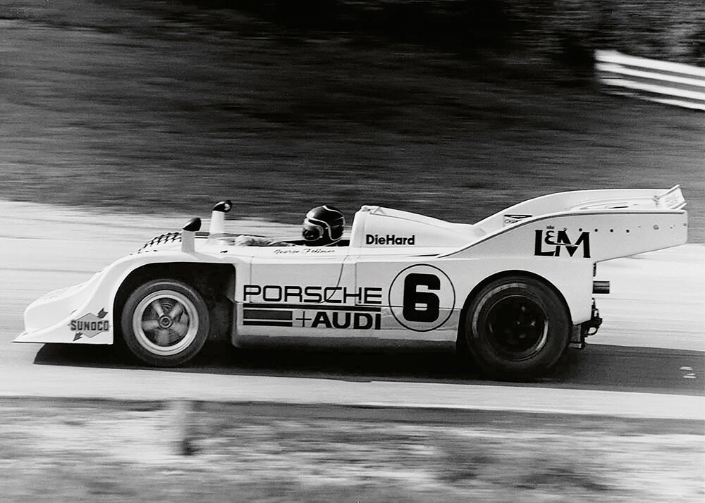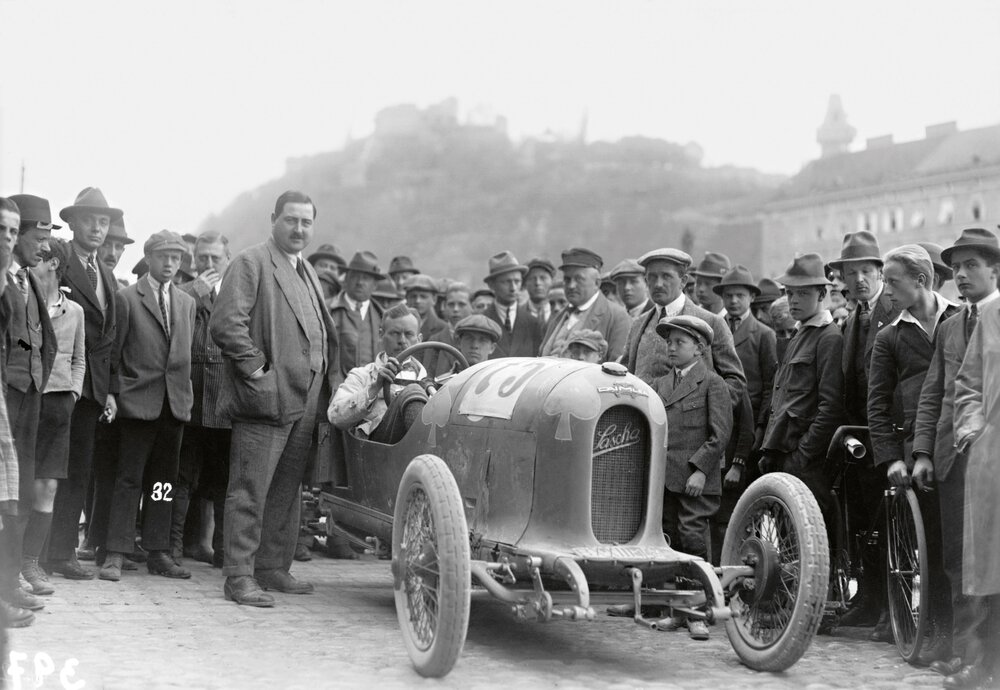 Austro-Daimler ADS-R “Sascha” at the Riesrennen race in Austria in 1922; on the left Count Alexander “Sascha” Kolowrat, driver Charles Bettaque is sitting inside of the car, Ferdinand Porsche and Ferry Porsche are standing right to the car