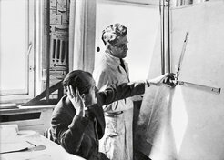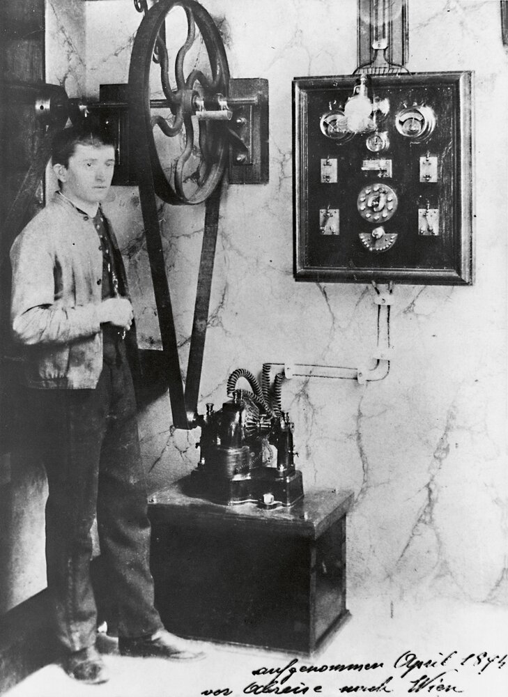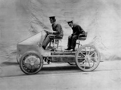 Ferdinand Porsche driving a Lohner-Porsche electric racing car in 1900, one of the first vehicles he built himself; sitting behind him is Karl Paulal, operations manager at Jacob Lohner & Co. at the plant in Floridsdorf, Vienna