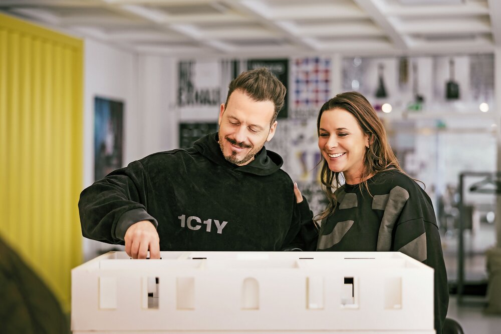 Yasemin and Tom Lupo (l.) with an architectural model of the Creative Hub in Kyiv, Ukraine