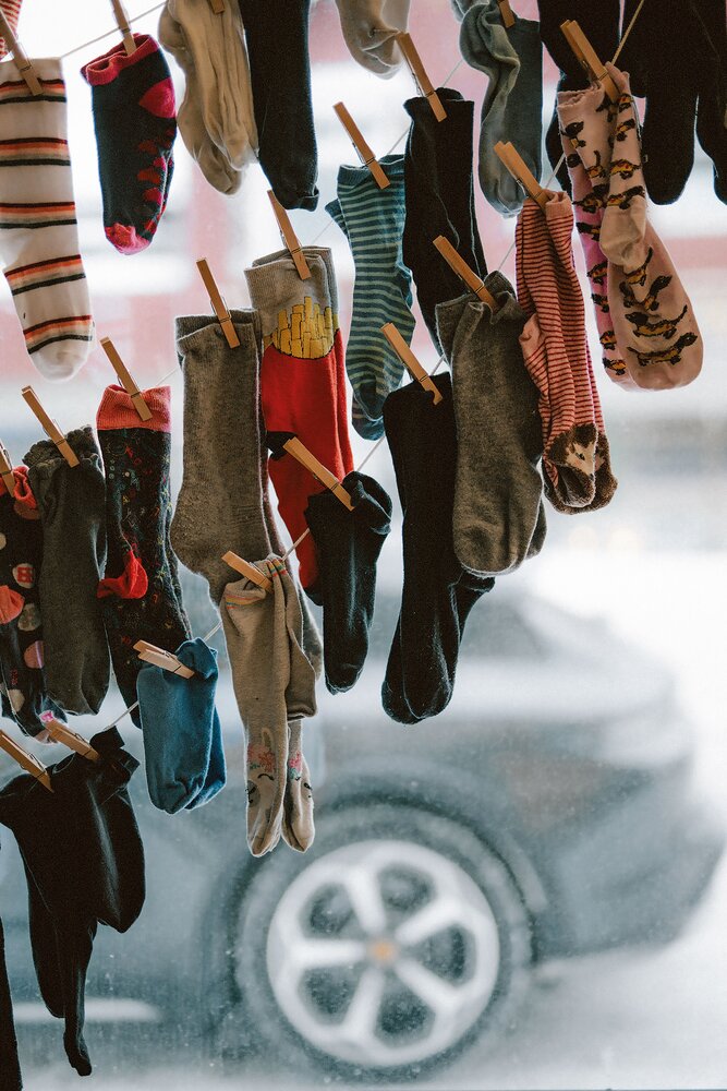 Socks in the window of the Øie Trafikkskole driving school, Norway
