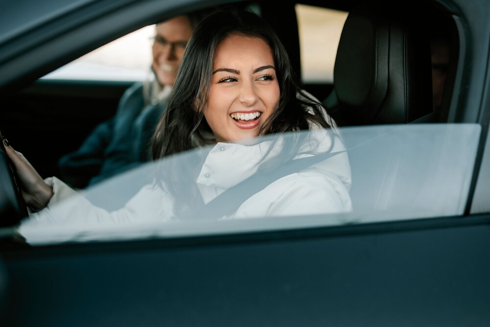 Driving school owner Sonja Øie Petersen and Margerita Sotomayor in the driving school car, a Porsche Taycan 4 Cross Turismo