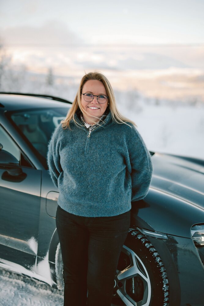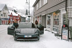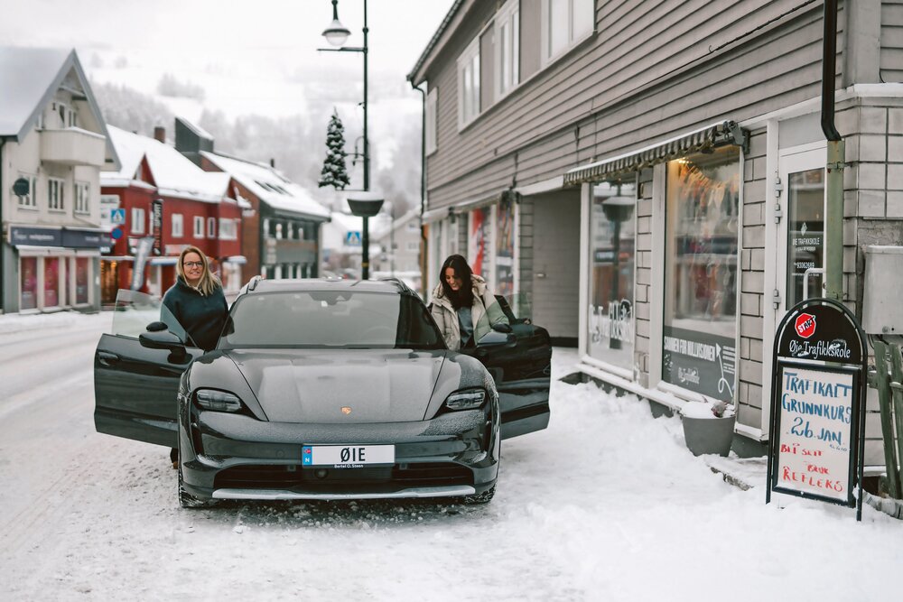 Driving school owner Sonja Øie Petersen and Margerita Sotomayor at the driving school car, a Porsche Taycan 4 Cross Turismo, in Fagernes, Norway